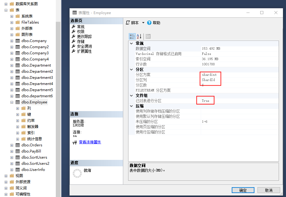 4,为表创建分区;如下示例;选择Employee表(100万行数据);右键->属性->存储->创建分区