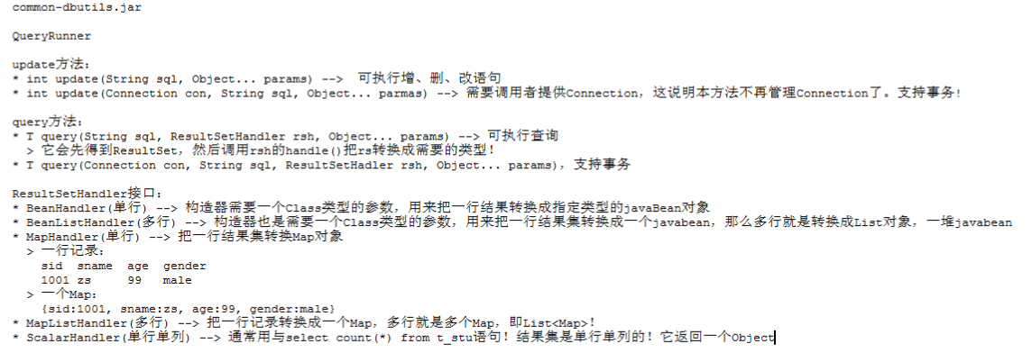 package cn.cmlx.c3p0; import java.sql.SQLException; import java.util.List; import java.util.Map; import org.apache.commons.dbutils.QueryRunner; import org.apache.commons.dbutils.handlers.BeanHandler; import org.apache.commons.dbutils.handlers.BeanListHandler; import org.apache.commons.dbutils.handlers.MapHandler; import org.apache.commons.dbutils.handlers.MapListHandler; import org.apache.commons.dbutils.handlers.ScalarHandler; import org.junit.Test; import cn.cmlx.jdbcutils.JdbcUtil2; public class DbutilsUsing { /** * update方法,可执行增、删、改语句。 * @throws SQLException */ @Test public void fun1() throws SQLException { QueryRunner qr = new QueryRunner(JdbcUtil2.getDataSource()); String sql = "insert into stu values(?,?,?,?)"; Object[] params = {2,"郑强",22,"male"}; qr.update(sql,params); } /** * query方法,可执行查询语句。 */ /** * BeanHandler的应用 * 把一行结果集转换成指定类型的javaBean对象 * @throws SQLException */ @Test public void fun2() throws SQLException { QueryRunner qr = new QueryRunner(JdbcUtil2.getDataSource()); String sql = "select * from stu where id=?"; Object[] params = {2}; Stu stu = qr.query(sql, new BeanHandler<Stu>(Stu.class),params); System.out.println(stu); } /** * BeanListHandler的应用,它是多行结果集处理器 * 每行对应一个Stu对象 * @throws SQLException */ @Test public void fun3() throws SQLException { QueryRunner qr = new QueryRunner(JdbcUtil2.getDataSource()); String sql = "select * from stu"; List<Stu> stuList = qr.query(sql, new BeanListHandler<Stu>(Stu.class)); System.out.println(stuList); } /** * MapListHandler,它是单行处理器,把一行转换成一个Map对象 * @throws SQLException */ @Test public void fun4() throws SQLException { QueryRunner qr = new QueryRunner(JdbcUtil2.getDataSource()); String sql = "select * from stu where id=?"; Object[] params = {1}; Map map = qr.query(sql, new MapHandler(),params); System.out.println(map); } /** * MapListHandler,它是多行处理器,把每行都转换成一个Map,即List<Map> * @throws SQLException */ @Test public void fun5() throws SQLException { QueryRunner qr = new QueryRunner(JdbcUtil2.getDataSource()); String sql = "select * from stu"; List<Map<String,Object>> mapList = qr.query(sql, new MapListHandler()); System.out.println(mapList); } /** * ScanlarHandler,它是单行单列时使用,最为合适! * @throws SQLException */ @Test public void fun6() throws SQLException { QueryRunner qr = new QueryRunner(JdbcUtil2.getDataSource()); String sql = "select count(*) from stu"; /** * Integer、Long、BigInteger,他们有共同的父类Number */ Number cnt = (Number)qr.query(sql, new ScalarHandler()); Long c = cnt.longValue(); System.out.println(cnt); } }