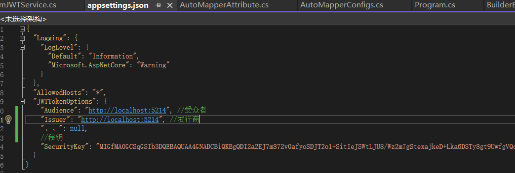 A.appsetting.cs中配置如下:JWTTokenOptions