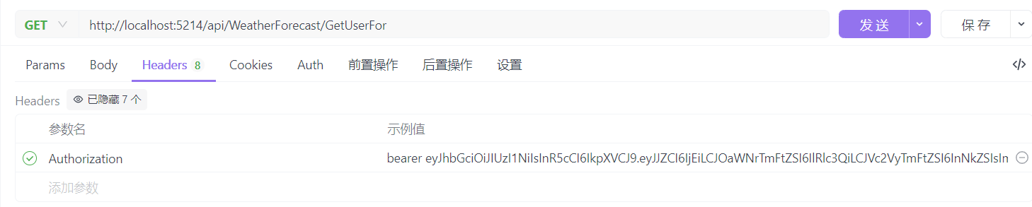 Apifox请求,请求头中添加参数Authorization,value=bearer+空格+tooken值(API种获取头部信息)