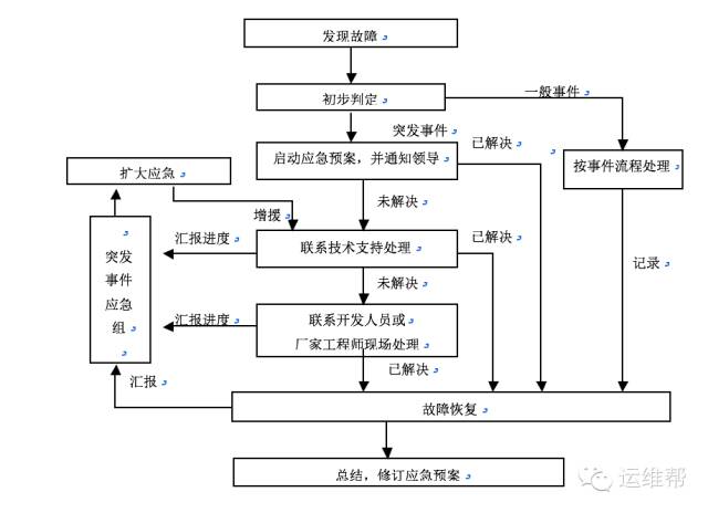 (2)正常情况下,要求值班人员在10分钟内进行事件确认。如果属于一般事件则按照事件流程进行分派处理,否则应迅速启动《应急预案》,并严格按照《应急预案》所规定的步骤快速实施应急处置,及时汇报上级领导,掌握实时处理情况。