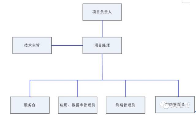 本运维项目的运维管理结构位三层模式,具体如下图所示。由项目负责人与甲方进行业务范围接洽,并将沟通结果向下传递。项目经理负责项目的整体运维工作,包括各种制度的制定和实施。运维工程师则在项目经理的指导下开展维护工作。