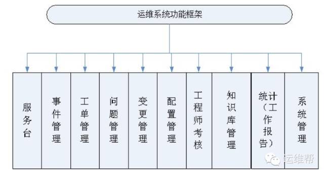 根据建设单位的系统结构和业务开展需要,运维项目组将项目的维护框架分为9个具体组成部分,分别为:服务台、时间管理。工单管理、问题管理、变更管理、配置管理、工程师考核、知识库管理、统计、系统管理等9个子项。而具体运维流程将以此为依据开展工作。