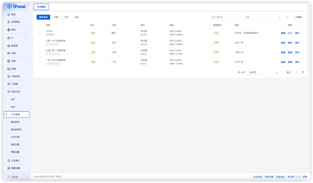 1Panel V2版本启用“主从式”多机管理架构,用户通过一台主机,即可集中连接和管控多台从机服务器,从而实现资源监控、应用部署、命令下发等核心运维操作。新版1Panel还支持节点状态的实时同步与分组管理,能够轻松应对多服务器环境下的复杂场景,真正实现“单一面板统一运维、多主机高效协同”的目标,大幅提升企业运维管理的效率和便捷性。