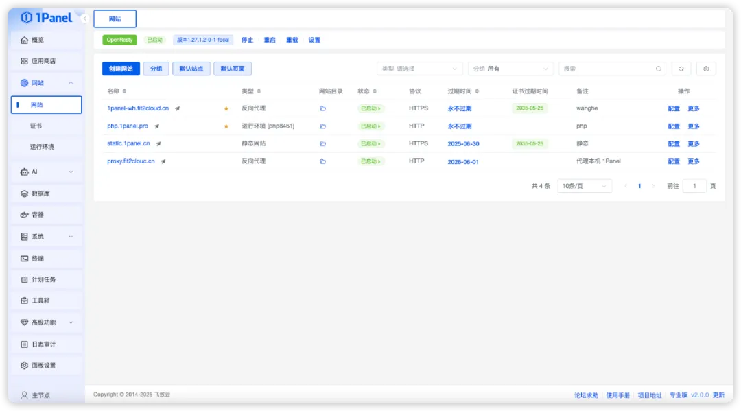 1Panel V2版本新增支持创建子网站类型,满足多站点或目录隔离的部署需求。同时,在创建网站时支持一键启用HTTPS,以提升访问安全性。