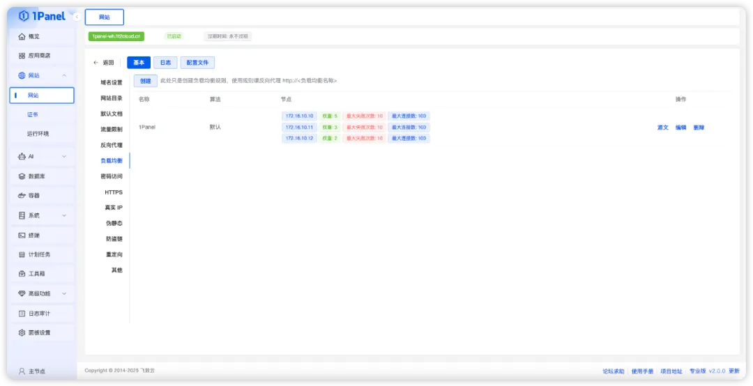 1Panel V2版本内置网站负载均衡功能,支持可视化配置,操作简便高效。借助这一功能,用户可以灵活设置多节点流量分发、主备节点切换、健康检查等策略,显著提升网站在高并发场景下的稳定性与抗压能力。无论是单站扩容,还是多站协同部署,均可一键实现,有效保障用户访问体验。