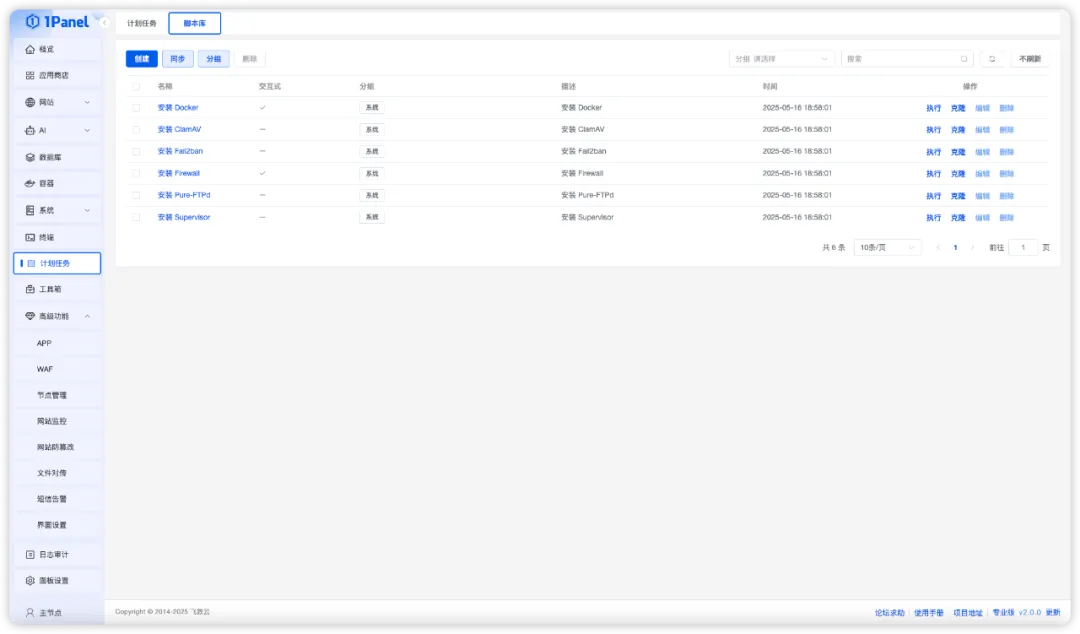 为了解决手动安装常用工具的问题,1Panel V2版本支持集中管理工具箱中的各类应用安装脚本。用户不仅可以基于内置脚本一键克隆并自定义调整,也可以上传自定义脚本至脚本库,在创建Shell类型计划任务时直接调用,实现脚本的统一维护、灵活调度与高效复用,快速构建智能、高效的自动化运维体系。