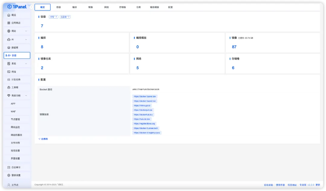 容器管理方面,1Panel V2版本新增容器的“概览”页面,方便用户实时查看容器运行状态。同时,支持更多的容器自定义参数配置,满足复杂部署的需求。