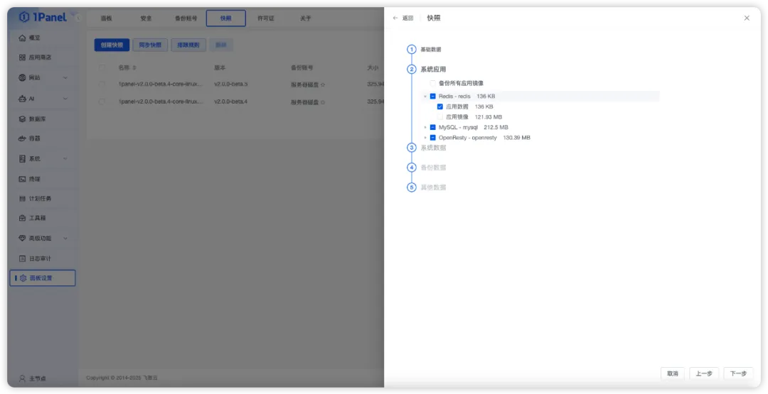 1Panel V2提供了全新的系统快照功能,支持用户根据实际需求自定义快照策略,实现灵活、多样化的数据备份管理。