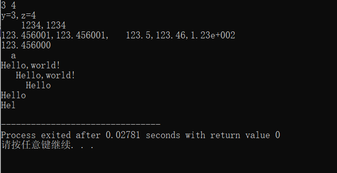 //ex2.cpp #include<stdio.h> int main(){ int x=1234; float f=123.456; double m=123.456; char ch='a'; char a[]="Hello,world!"; int y=3,z=4; printf("%d %d\n",y,z); printf("y=%d,z=%d\n",y,z); printf("%8d,%2d\n",x,x); printf("%f,%8f,%8.1f,%0.2f,%.2e\n",f,f,f,f,f); printf("%lf\n",m); printf("%3c\n",ch); printf("%s\n%15s\n%10.5s\n%2.5s\n%.3s\n",a,a,a,a,a); return 0; }