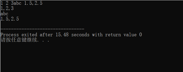 //ex3.cpp #include<stdio.h> int main(){ double x,y; char c1,c2,c3; int a1,a2,a3; scanf("%d%d%d",&a1,&a2,&a3); printf("%d,%d,%d\n",a1,a2,a3); scanf("%c%c%c",&c1,&c2,&c3); printf("%c%c%c\n",c1,c2,c3); scanf("%lf,%lf",&x,&y); printf("%.1f,%.1f\n",x,y); return 0; }