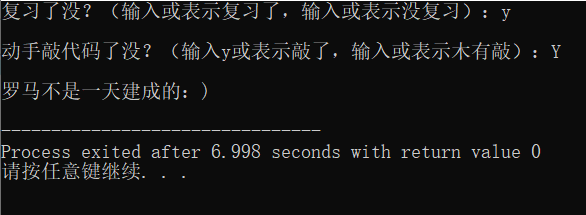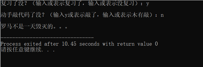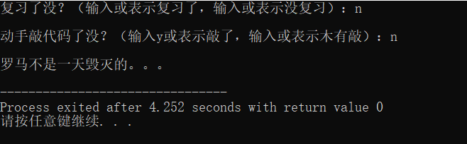 //ex5.cpp #include<stdio.h> int main(){ char ans1,ans2; printf("复习了没?(输入或表示复习了,输入或表示没复习):"); ans1=getchar(); getchar(); printf("\n动手敲代码了没?(输入y或表示敲了,输入或表示木有敲):"); ans2=getchar(); if((ans1=='y'||ans1=='Y')&&(ans2=='y'||ans2=='Y')) printf("\n罗马不是一天建成的:)\n") ; else printf("\n罗马不是一天毁灭的。。。\n"); return 0; }