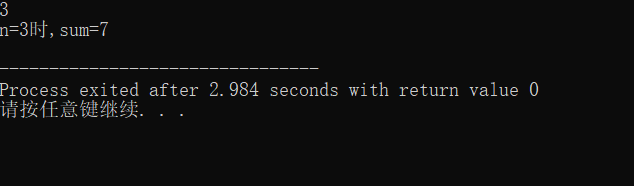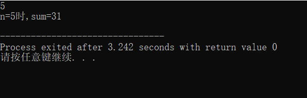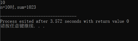 //ex6.cpp #include<stdio.h> #include<math.h> int main(){ int n,sum; scanf("%d",&n); sum=pow(2,0)*(1-pow(2,n))/(1-2); printf("n=%d时,sum=%d\n",n,sum); return 0; }