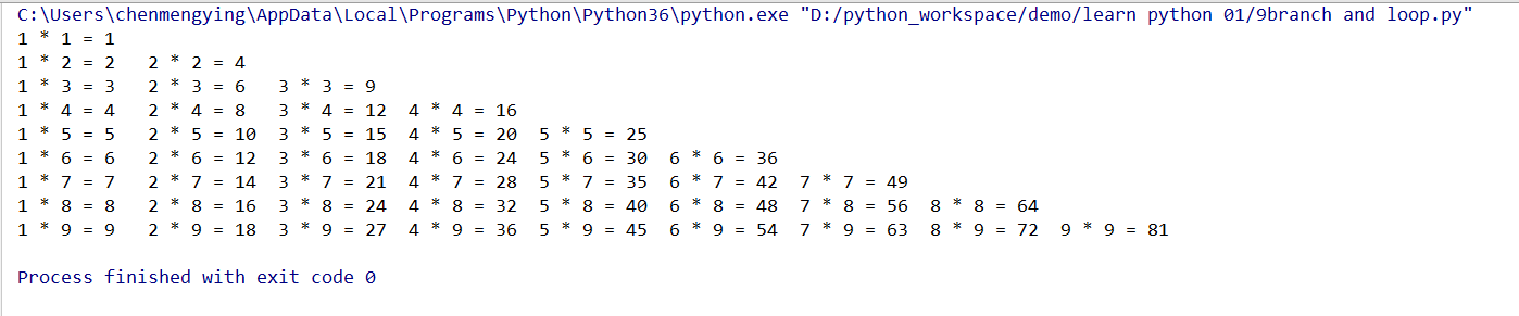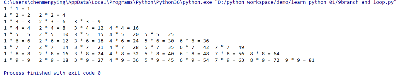 for hang in range(1,10): for lie in range(1,hang+1): print(lie,"*",hang,"=",lie*hang,end="\t") print()