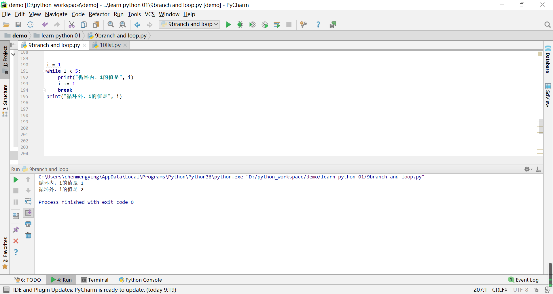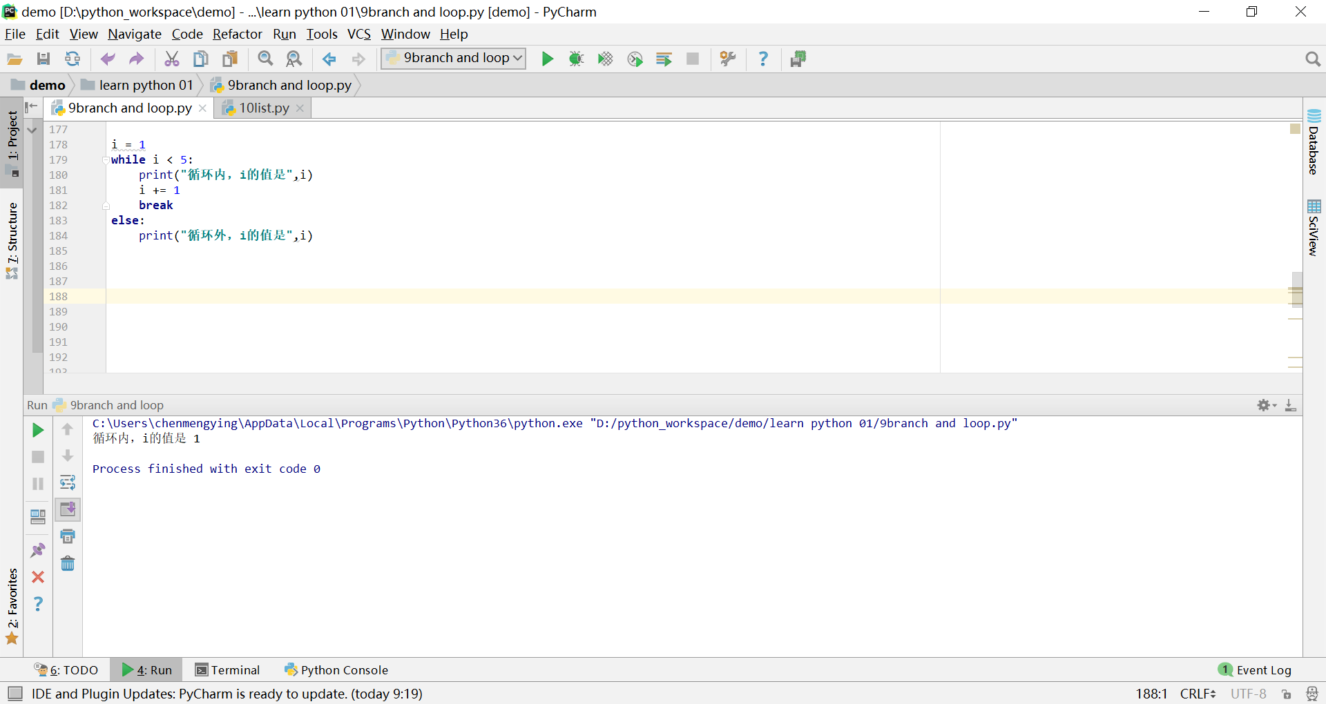 while...else...非常容易地检测到循环退出状况,经常与break搭配使用。break语句是一个可以使得循环语句死于非命的家伙,else语句的定义是:当循环条件不再为真的时候,else语句才会被执行。换言之,我们使用break语句跳出循环时是中途跳出来的,这时候条件依然为真,所以用break语句跳出来,那么else语句的内容并不会被执行