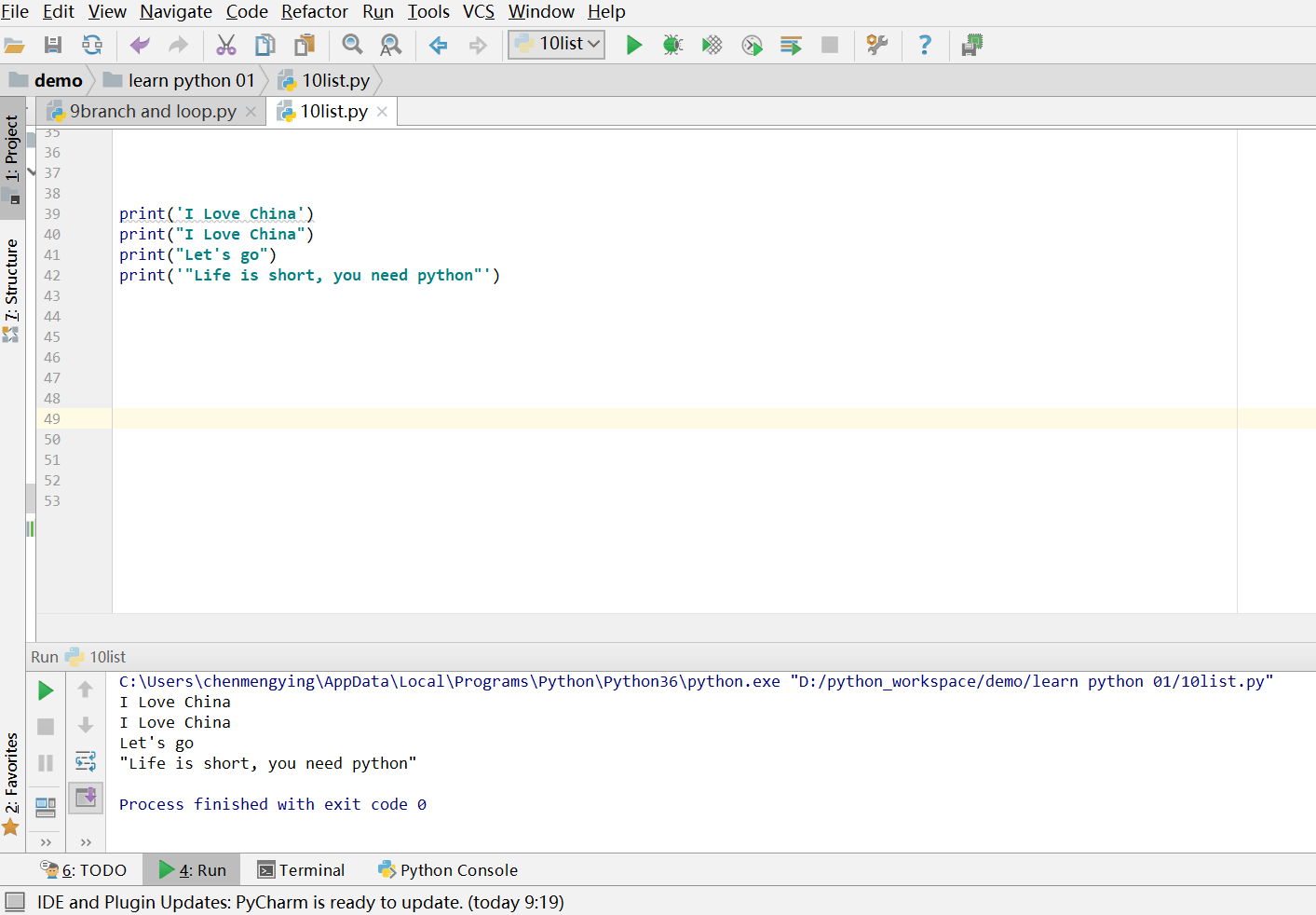思考:如何打印 "Life is short, let's learn python"(需要显示的文本里既有单引号又有双引号)