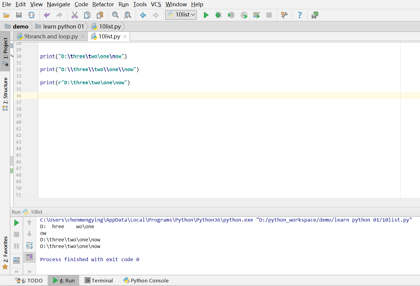 ①使用场景:由于windows使用反斜杠作为分隔符显示路径时,所以当要求显示路径时,python就会产生误会 e.g如下所示:
