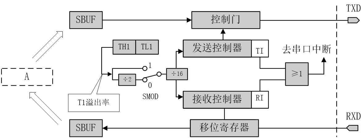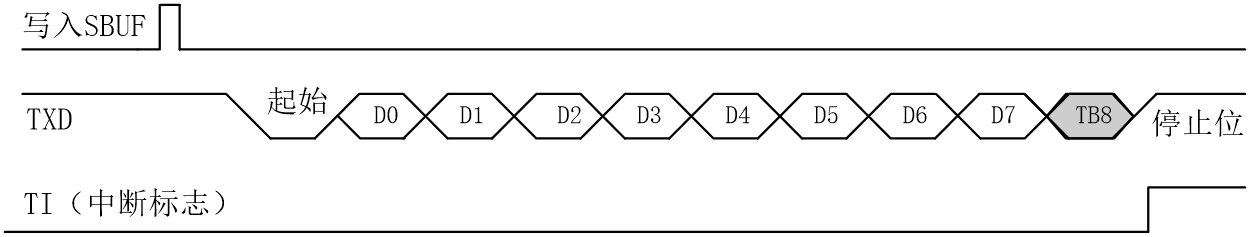 发送开始时,先把起始位0输出到TXD引脚,然后发送移位寄存器的输出位(D0)到TXD引脚,每一个移位脉冲都使输出移位寄存器的各位右移一位,并由TXD引脚输出