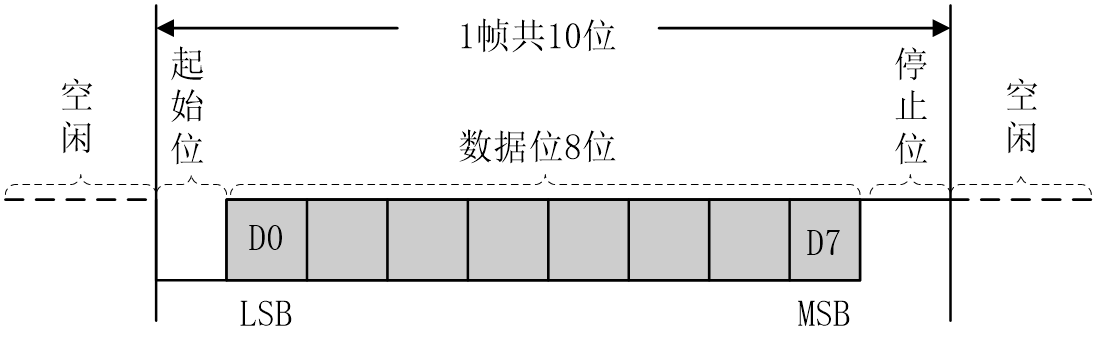 方式1是10位数据的异步通信口,TXD为数据发送引脚,RXD为数据接收引脚,传送一帧数据的格式如图所示,其中1位起始位,8位数据位,1位停止位