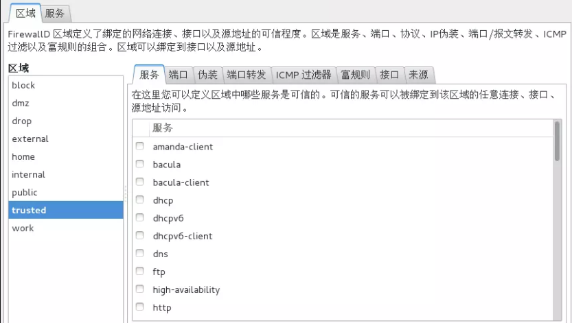 信任区域(trusted):所有的网络连接都可以接受。
