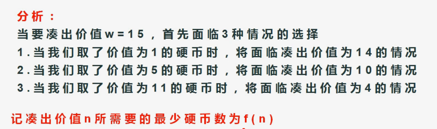 比如F(15) :如果取1元的硬币就是1个1元硬币+价值为14的f(14)的硬币,如果是取5元的硬币就是1个5元硬币+价值为10的f(10)的硬币