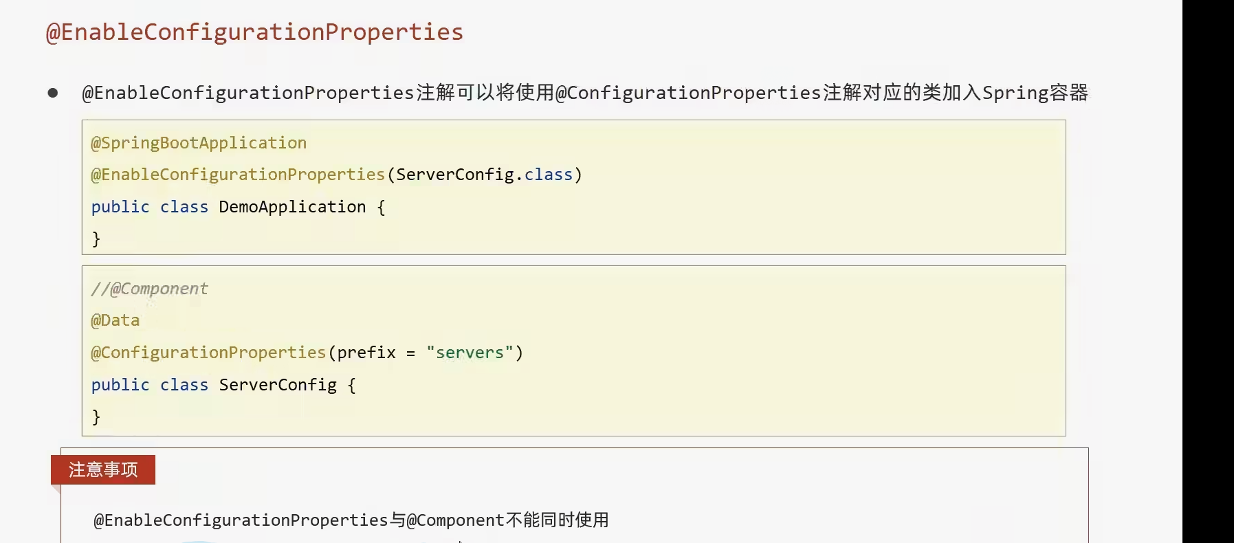 指定配置属性的类中又有一个bean,因为这个注解是要加载spring属性的配置,所以它会自动把它封装成一个bean。所以一共有两个bean。所以,@Component和@EnableConfigruationProperties不可并存。