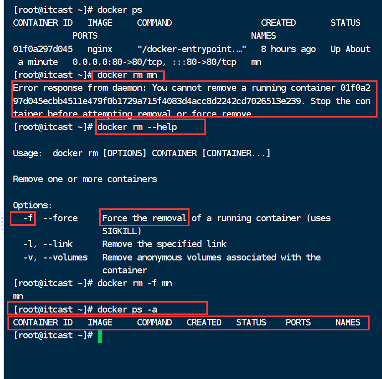 直接删除运行的容器会报错,所以加个-f强制删除即可