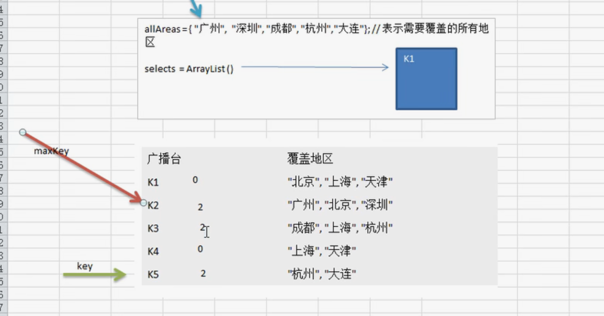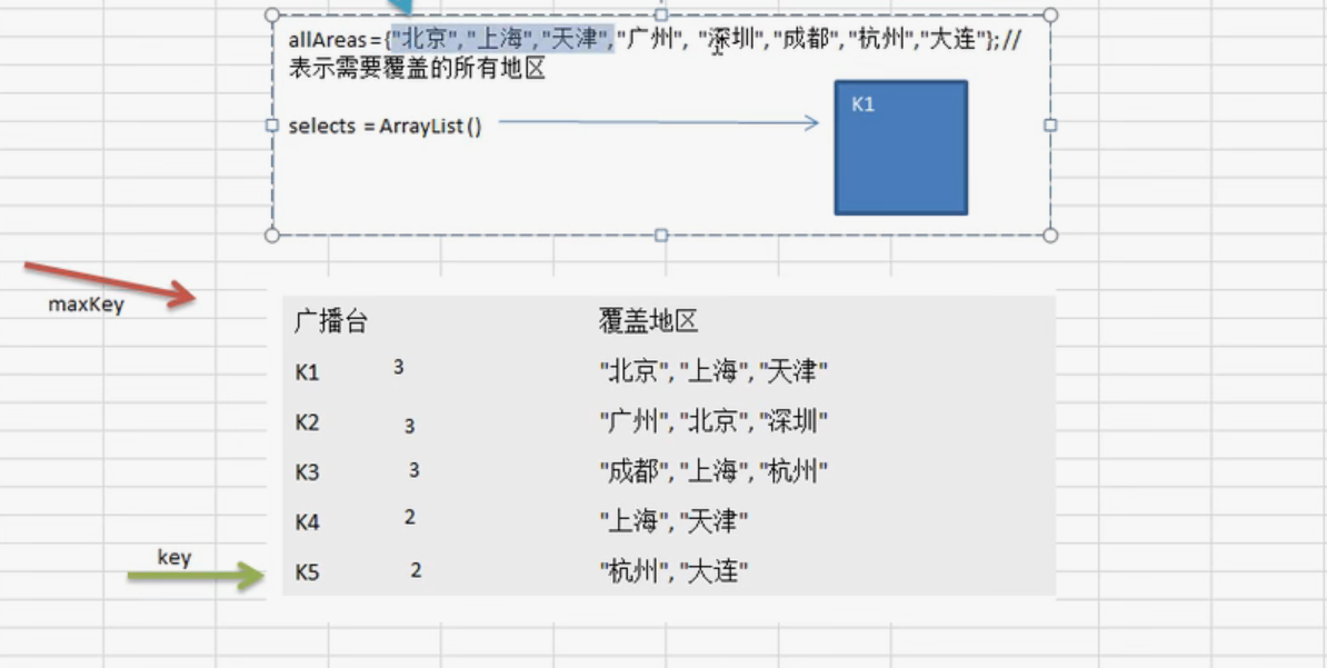 //定义maxKey,保存在一次遍历过程中,能够覆盖最大未覆盖的地区对应的电台的key
