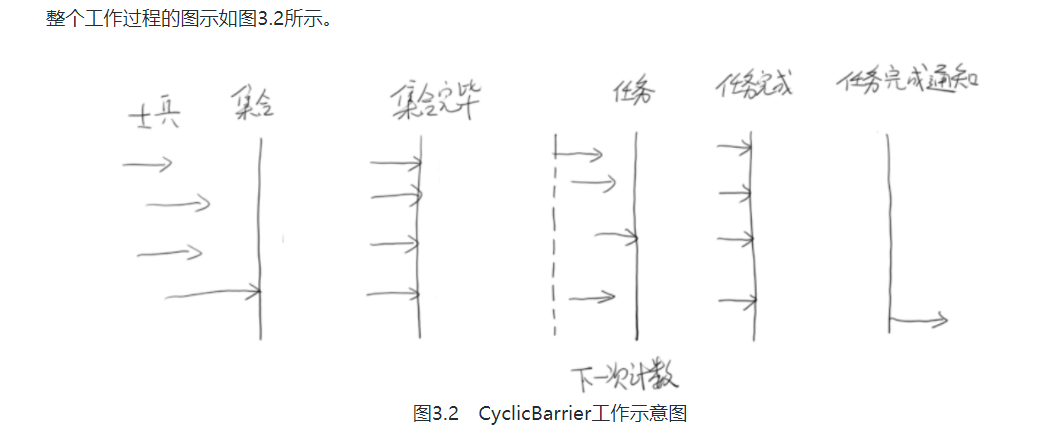 CyclicBarrier的使用场景也很丰富。比如,司令下达命令,要求10个士兵一起去完成一项任务。这时,就会要求10个士兵先集合报道,接着,一起雄赳赳气昂昂地去执行任务。当10个士兵把自己手头的任务都执行完成了,那么司令才能对外宣布,任务完成!