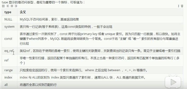 type显示的是访问类型,是较为重要的一个指标,可取值为: