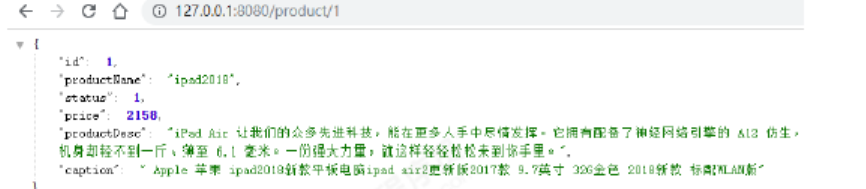 上面这段配置的意思是,配置了一个 id 为 product-service的路由规则,当访问网关请求地址以product 开头时,会自动转发到地址: http://127.0.0.1:9002/ 。配置完成启动项目即可在浏览器访问进行测试,当我们访问地址http://localhost:8080/product/1 时会展示页面展示如下: