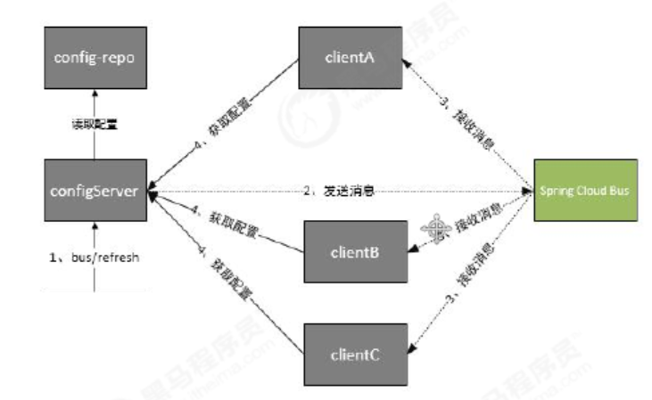 根据此图我们可以看出利用Spring Cloud Bus做配置更新的步骤: