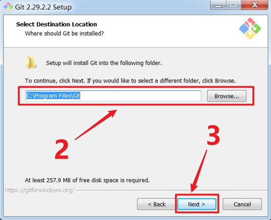 3.接着,设置安装路径,点击 “Browse…” 选择安装 Git 到该文件夹,我建议选择 D 盘(非系统盘)。我这里演示用的是 C 盘。然后,点击 “Next” 进行下一步。