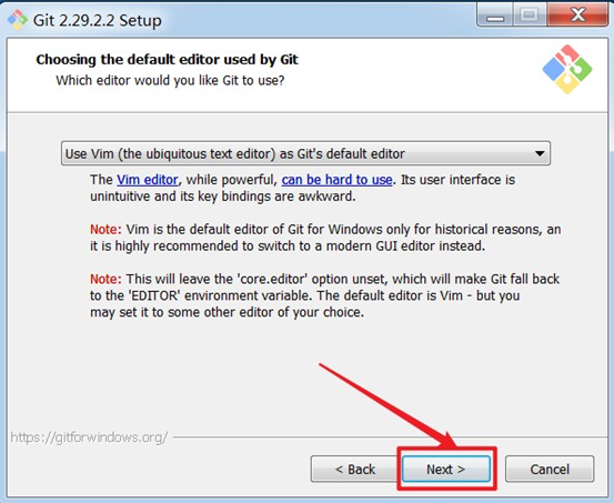 6.这里是设置 Git 默认编辑器,我们这里直接下一步 “Next”。
