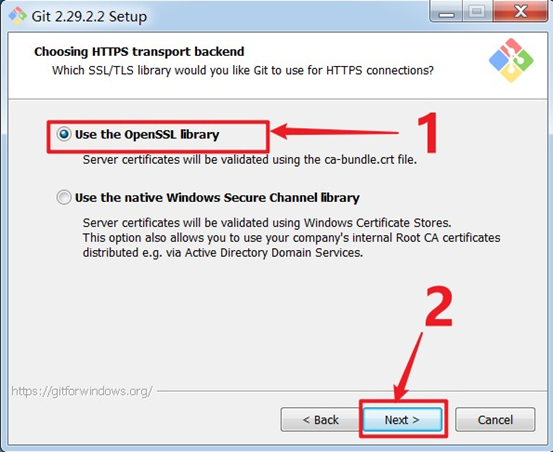 2)Use the native Windows Secure Channel library. (使用本机Windows安全通道库。服务器证书将使用Windows证书库进行验证,这个选项也允许你使用公司内部的根CA证书,例如通过活动目录域服务分发。使用本机的Windows安全通道库服务器证书将使用Windows证书库进行验证,这个选项也允许你使用公司内部的根CA证书,例如通过活动目录域服务分发的证书。这个选项也允许你使用公司内部的根CA证书。例如通过Active Directory Domain Services。)