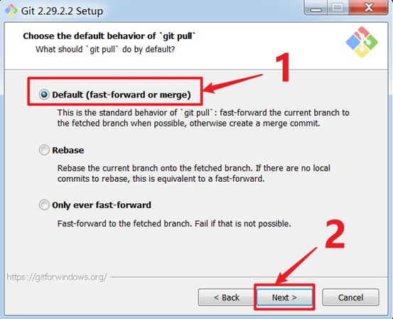 1)Default(fast-forward or merge) 默认(快进或合并):这是git pull的标准行为:尽可能将当前分支快进到获取的分支,否则就创建一个合并提交。