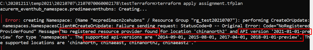 Error: creating Namespace: (Name "mcpredimacn2cehubns" / Resource Group "rg_test20210707"): performing CreateOrUpdate: namespaces.NamespacesClient#CreateOrUpdate: Failure sending request: StatusCode=0 -- Original Error: Code="NoRegisteredProviderFound" Message="No registered resource provider found for location 'chinanorth2' and API version '2021-01-01-preview' for type 'namespaces'. The supported api-versions are '2014-09-01, 2015-08-01, 2017-04-01, 2018-01-01-preview'. The supported locations are 'chinanorth, chinaeast, chinanorth2, chinaeast2'."