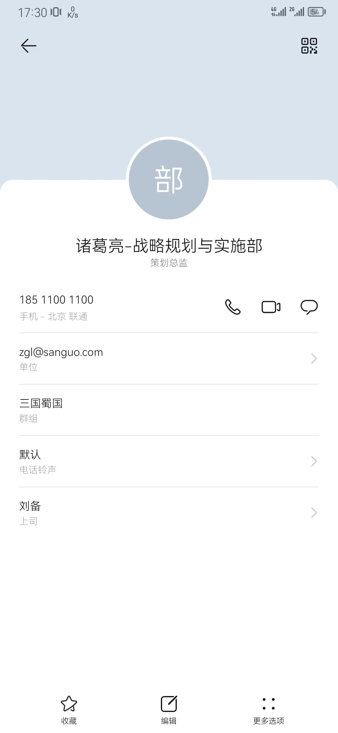 | 诸葛亮 | 战略规划与实施部 | 18511001100 | zgl@sanguo.com | 策划总监 | 刘备 |