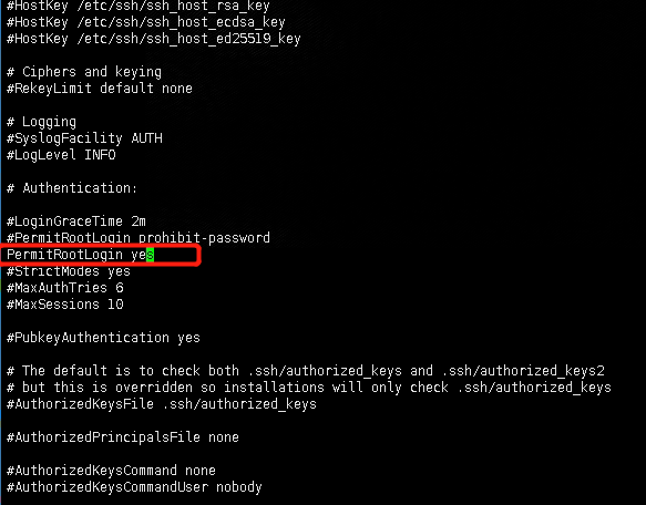 2.4、点击键盘的i键进入编辑模式,在上面步骤找到的关键字下添加 PermitRootLogin yes。