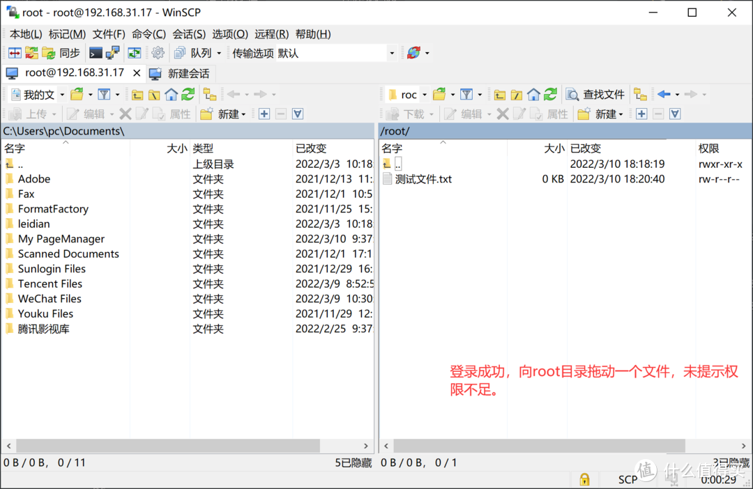 2.8、打开winscp,使用root用户登录,登录成功,拖动一个文件测试,未提示权限不足,DSM7.0系统的root权限获取成功。