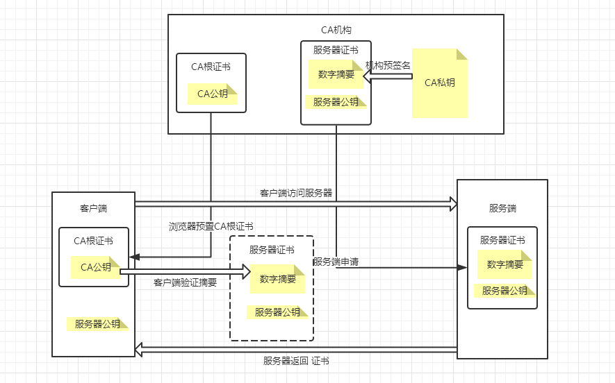 1:客户端浏览器会预置根证书, 里面包含CA公钥