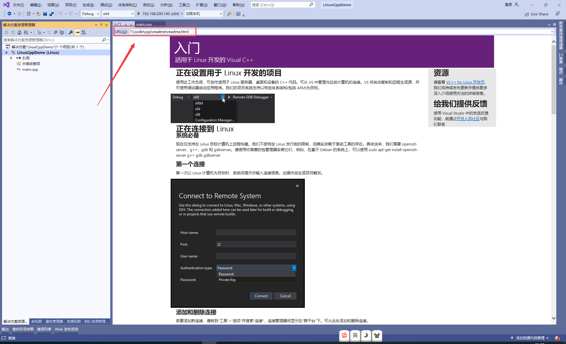 项目创建成功后,vs 会在项目的平级目录中创建 readme 入门指导教程,其中详细的介绍了远程调试配置: