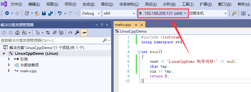 5、编写好程序代码后,选择前面配置的远程机器运行调试