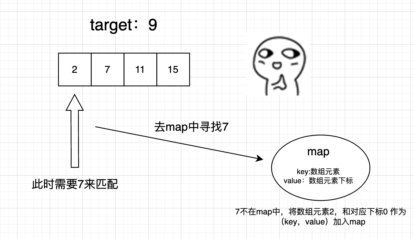 map目的用来存放我们访问过的元素,因为遍历数组的时候,需要记录我们之前遍历过哪些元素和对应的下表,这样才能找到与当前元素相匹配的(也就是相加等于target)。