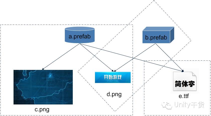a.prefab 和 b.prefab 需要打包,不做任何处理打包他们结果是:d.png 和 e.ttf 打包两份进去,浪费内外存。