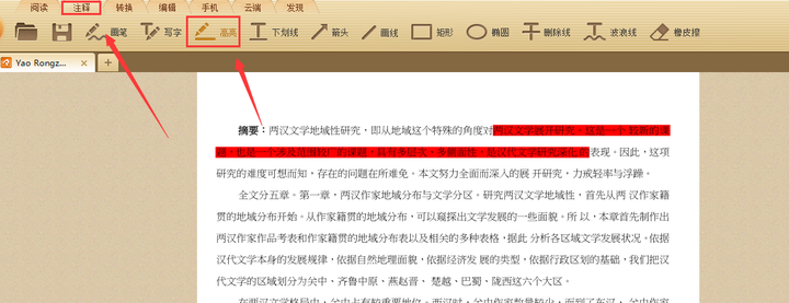 先用极速PDF阅读器打开我们需要高亮或修改高亮文档颜色的PDF文档后,点击左上角的“注释”后,选择“高亮”工具即可给选中的文本添加颜色。