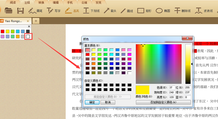 如需更换其他颜色,我们可以在选择高亮工具后,左上角弹出的颜色选项卡中更换其他颜色,或者点击右下角的白色可以进入色板进行更多选择。