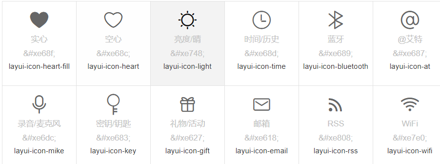 使用方法:通过对一个内联元素(一般推荐用 i标签)设定 class="layui-icon",来定义一个图标,然后对元素加上图标对应的 font-class(注意:layui 2.3.0 之前只支持采用 unicode 字符),即可显示出你想要的图标,譬如: