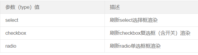orm.render(); //更新全部 form.render('select'); //刷新select选择框渲染 //……