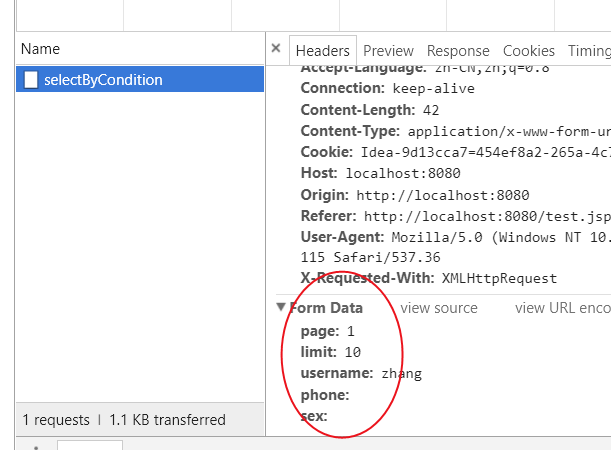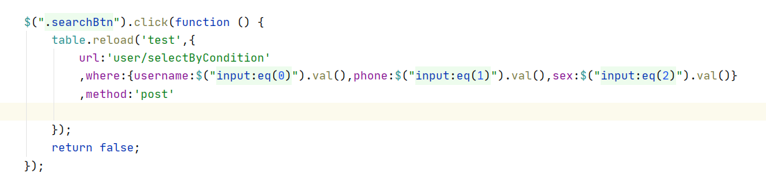 @RequestMapping(value = "/selectByCondition",produces="text/html;charset=utf-8") @ResponseBody public String selectByCondition(User user,int page, int limit){ System.out.println("selectByCondition执行了"); System.out.println("user:"+user); System.out.println("page:"+page); System.out.println("limit:"+limit); int start =(page-1)*limit; List<User> userList = userService.selectByCondition( user,start,limit); System.out.println("userList:"+userList); int count = userService.getCountByCondition(user); System.out.println("count:"+count); /*HashMap<String, Object> map = new HashMap<String,Object>(); System.out.println("map执行了吗?"); map.put("code",0); map.put("count",count); map.put("data",userList);*/ //用Json类封装前台中文都是? JSONObject jsonObject = new JSONObject(); jsonObject.put("code",0); jsonObject.put("count",count); jsonObject.put("data",userList); System.out.println(jsonObject.toString()); /*System.out.println("map:"+map);*/ return jsonObject.toString(); }